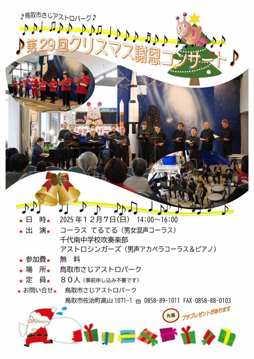 【日時】12月7日(日)14:00~16:00【場所】鳥取市さじアストロパーク【参加費】無料【定員】80人(事前申し込み不要です)【詳細】https://www.city.tottori.lg.jp/www/contents/1763007575826/index.html
