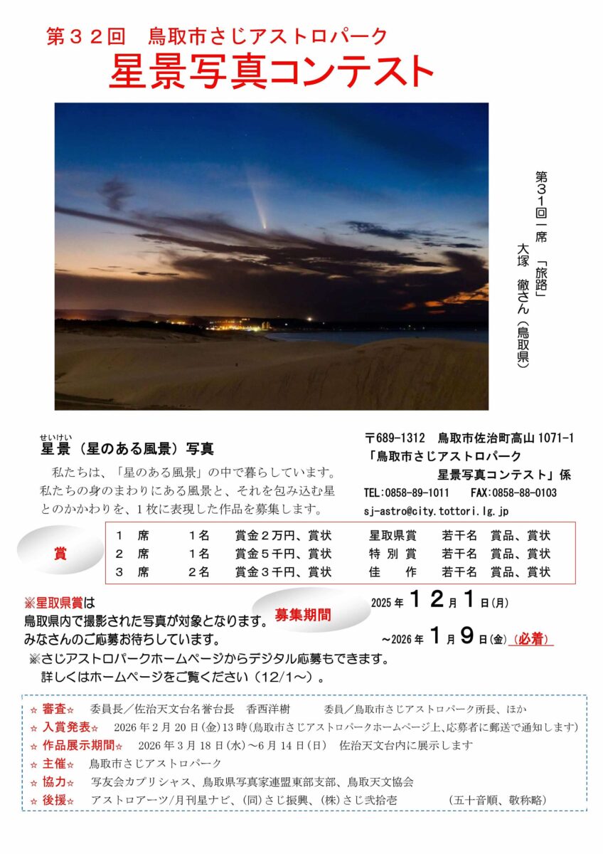 私たちは、「星のある風景」の中で暮らしています。私たちの身のまわりにある風景と、それを包み込む星とのかかわりを、1枚に表現した作品を募集します。【募集期間】2025年12月1日(月)~2026年1月9日(金)(必着)※コンテストの詳細や応募規定は、さじアストロパーク公式サイトでご確認ください。